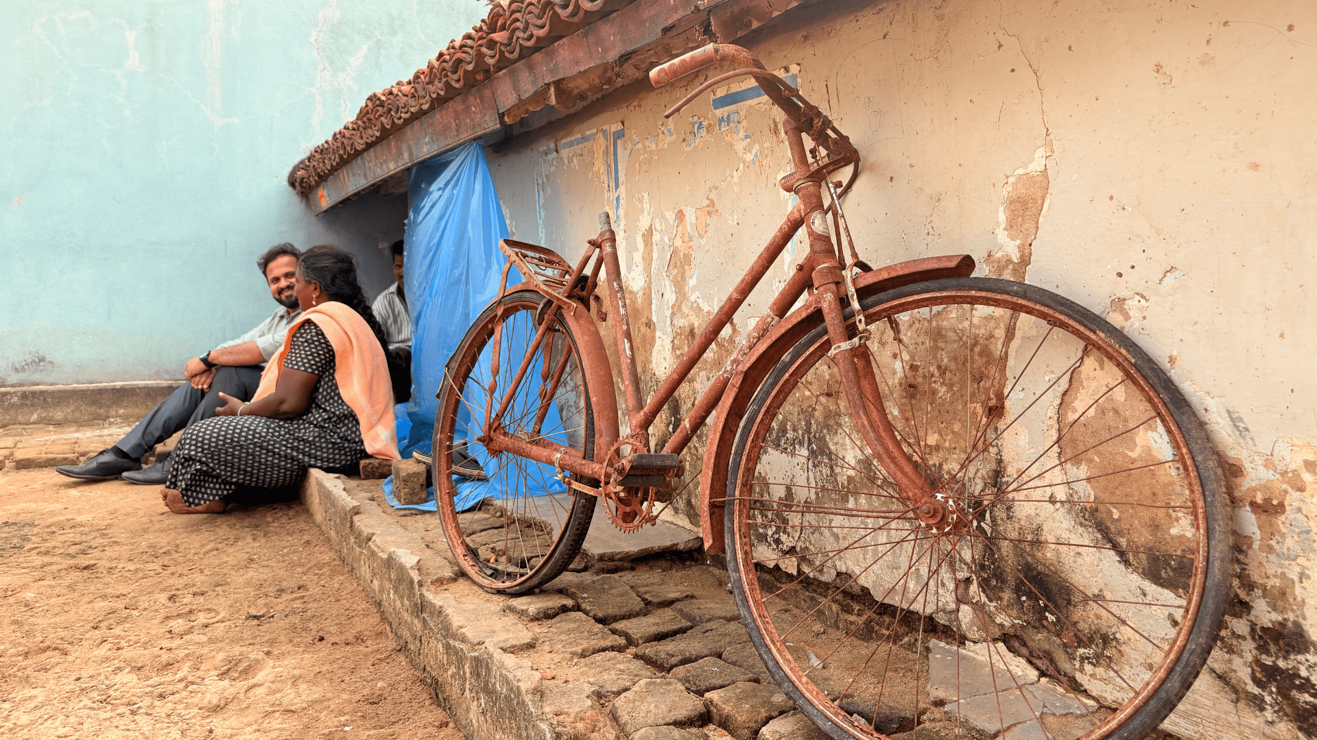 Shared Silences: Beneath an old tiled roof, a quiet conversation unfolds — not about data, but about daily survival. The rusting bicycle beside us carries years of effort, a record no report can capture. Fieldwork is measured not in surveys, but in shared silences.