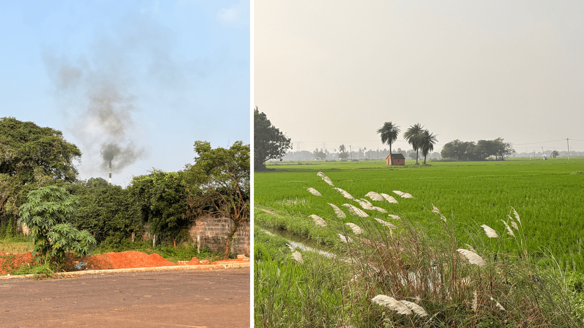 Image (left) Invisible Air, Visible Burden: Black smoke cuts through the sky over rural Tamil Nadu — a daily scene for families living at the edge of industrial zones. For mothers already burdened by caregiving and heat, polluted air isn’t abstract — it’s the silent weight they breathe in every day. Image (right) Fields of Fragile Calm: Green fields stretch endlessly across Tamil Nadu, but the air carries heat that never leaves. Each season grows more uncertain, and farming mothers carry that weight of harvests, hunger, and hope , shaping both their health and their children’s futures.