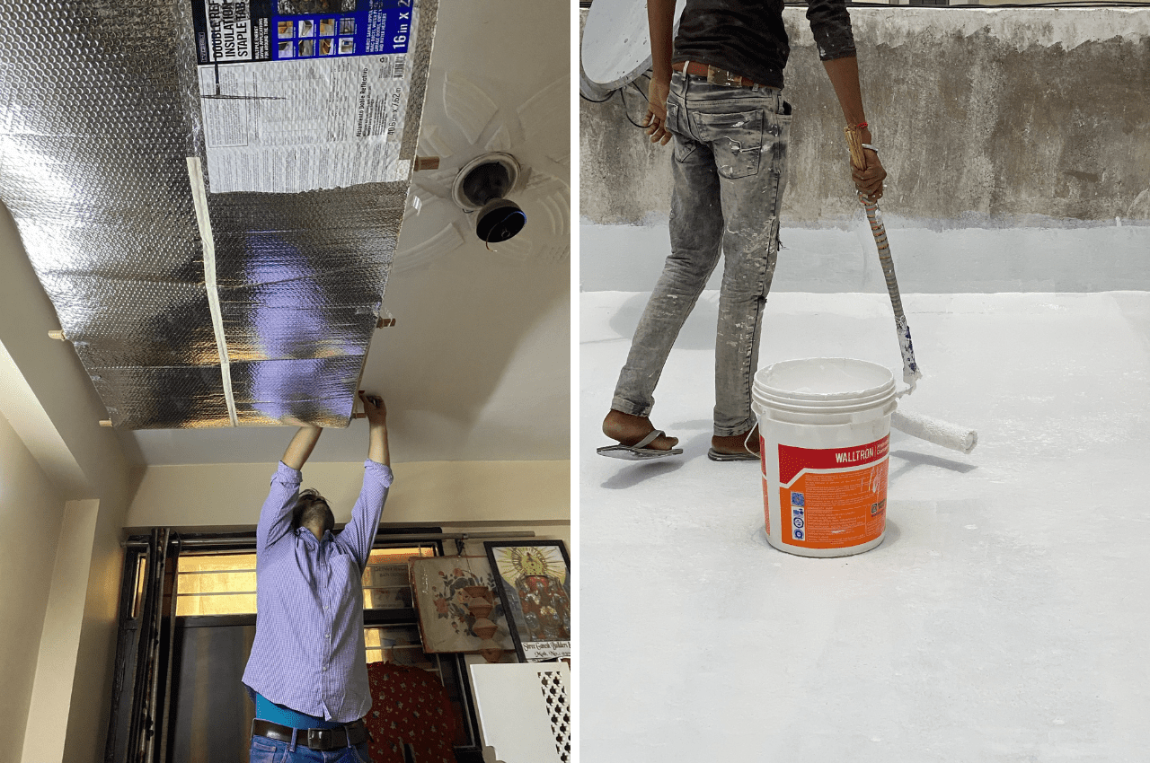 (left) Installation of a temporary Radiant Barrier to test effectiveness | (right) Application of Cool Roof paint on one of the pilot roofs