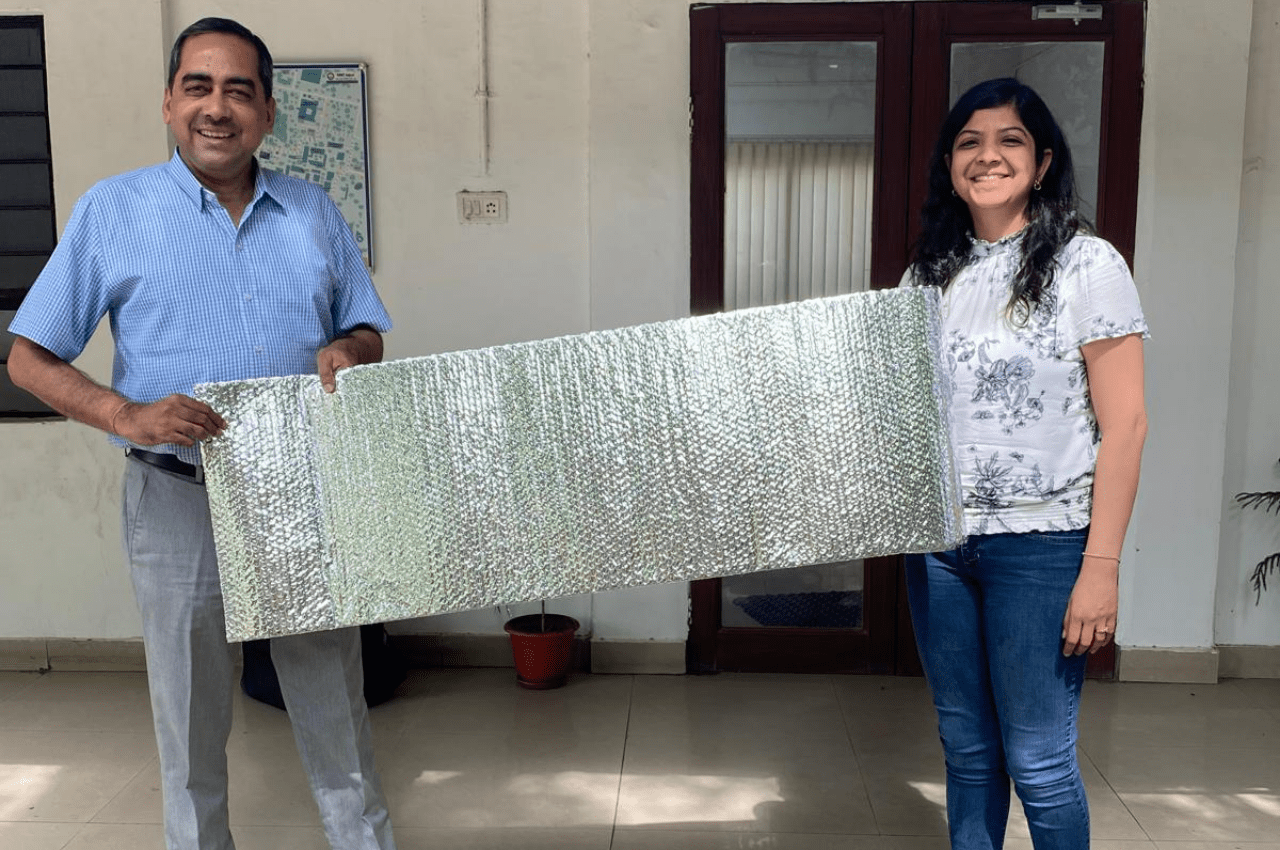 Jyotirmay Mathur, Professor of Mechanical Engineering at MNIT Jaipur, and Mayuri Rajput, Fellow at the Centre for Green Buildings and Cities, holding a Radiant Barrier before installation.