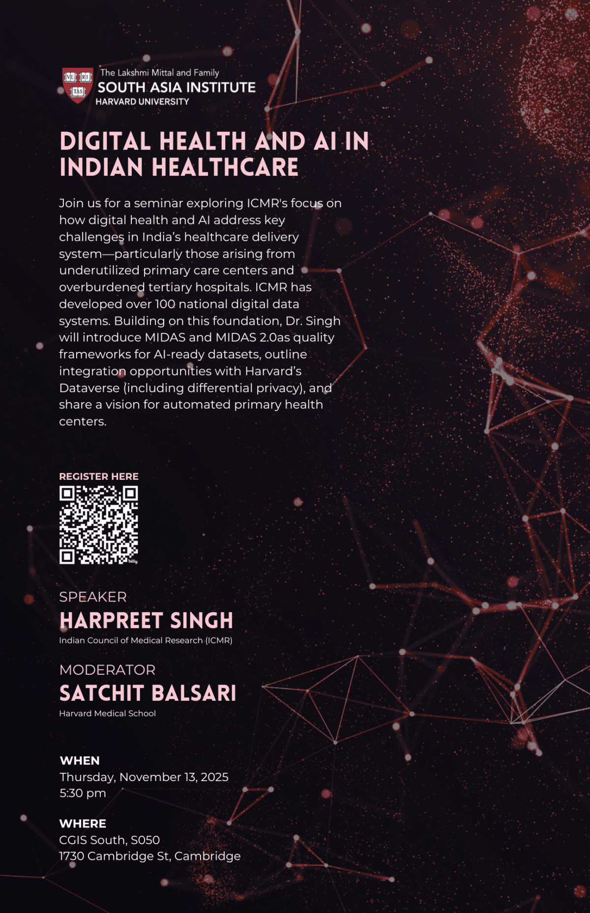 This seminar will cover ICMR’s focus on how digital health and AI address key challenges in India’s healthcare delivery system—particularly those arising from underutilized primary care centers and overburdened tertiary hospitals. ICMR has developed over 100 national digital data systems. Building on this foundation, Dr. Singh will introduce MIDAS and MIDAS 2.0as quality frameworks for AI-ready datasets, outline integration opportunities with Harvard’s Dataverse (including differential privacy), and share a vision for automated primary health centers.