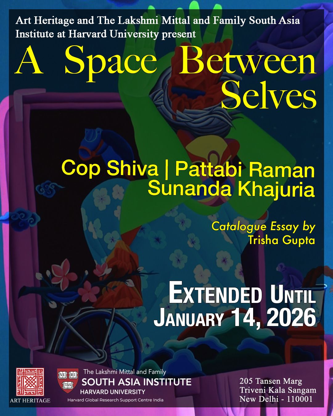 Art Heritage and The Lakshmi Mittal and Family South Asia Institute at Harvard University present “A Space Between Selves,” an exhibition of artworks by Mittal Institute’s three former Visiting Artist Fellows—Cop Shiva, Pattabi Raman, and Sunanda Khajuria—whose practices reflect a deep engagement with identity, transformation, and cultural hybridity.