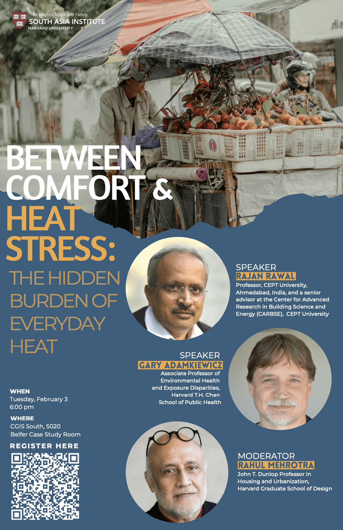 Abstract: This panel explores how heat is actually experienced in daily life – inside homes, workplaces, and cities. Drawing on perspectives from building science, urban design, and environmental health, Profs. Rajan Rawal and Gary Adamkiewicz will examine how everyday environments shape thermal exposure, behavior, and health. Moderated by Prof. Rahul Mehrotra, the discussion will highlight gaps between measured conditions and lived experience, and consider how design, infrastructure, and policy can better address the growing burden of heat where people live and work.