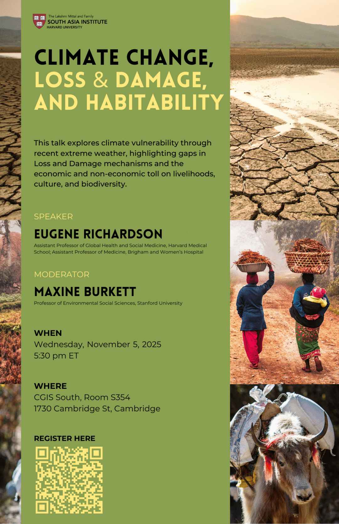 Join Eugene Richardson, M.D., Ph.D., Assistant Professor of Global Health and Social Medicine, Harvard Medical School; Assistant Professor of Medicine, Brigham and Women’s Hospital for a discussion on his Mittal Institute faculty climate grant project, “Climate Change, Loss and Damage, and Habitability.” With moderator Maxine Burkett, Professor of Environmental Social Sciences, Stanford University.