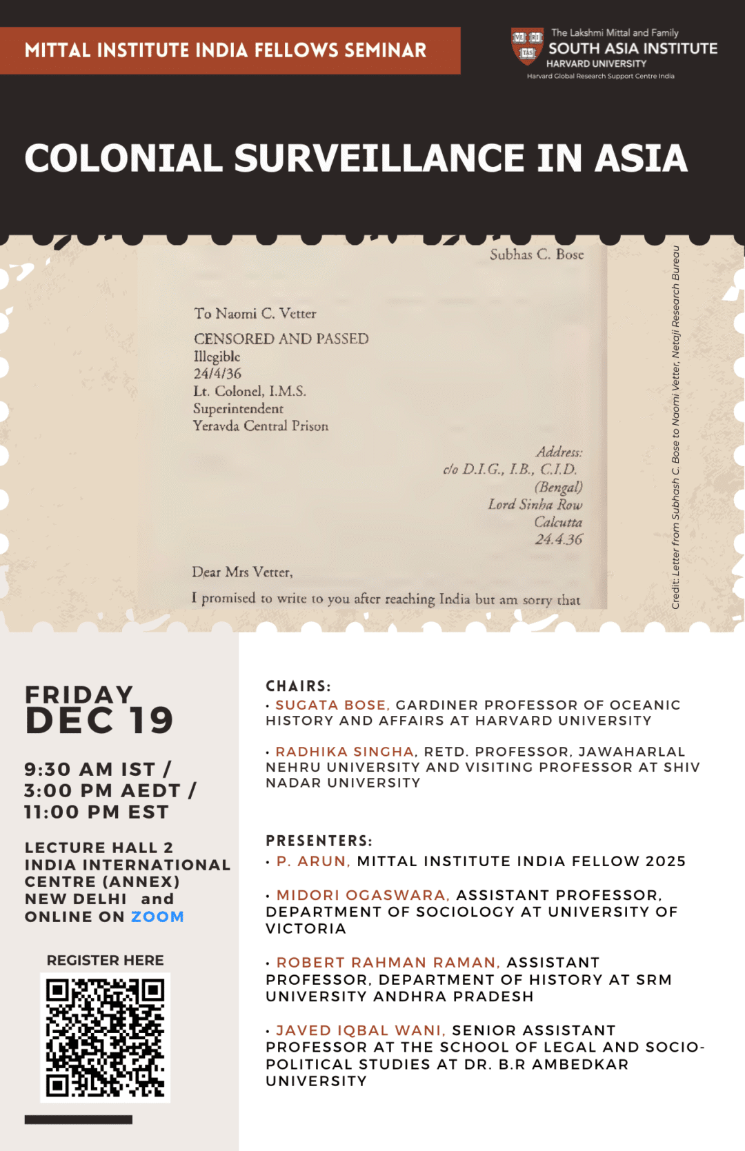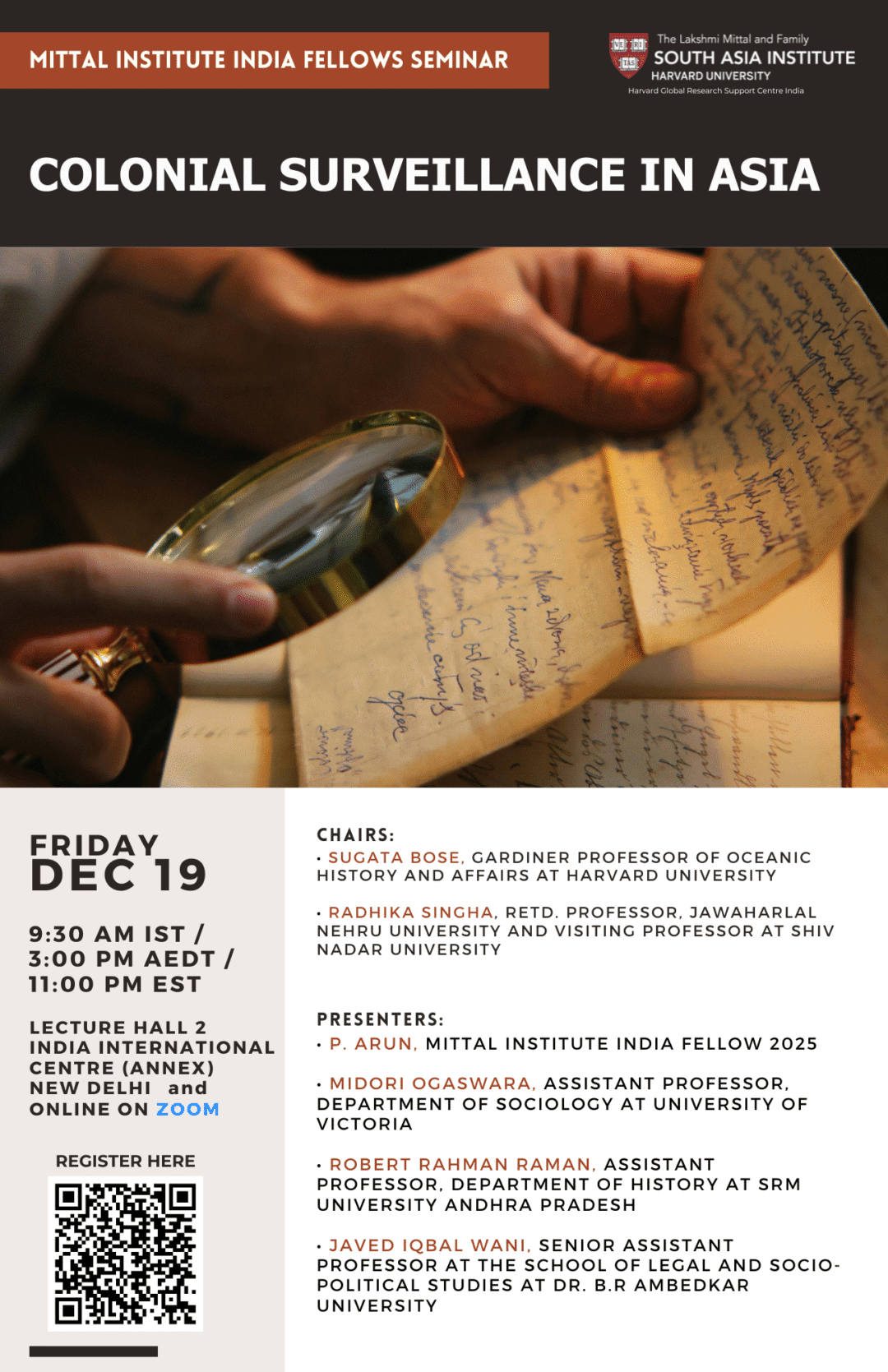 This seminar aims to explore the persistence and evolution of colonial surveillance under various imperial regimes in Asia. Colonial surveillance was an indispensable facet of imperial control across Asia. It operated through multifaceted mechanisms that were often repressive, coercive, racialized, and gendered, and were executed through measures such as policing, intelligence gathering, interception, detention, censorship, and propaganda. Such practices were driven by the imperial need for knowledge and control, and by anxieties surrounding the governance of colonial territories perceived as unstable or dangerous. Rather than being monolithic, colonial surveillance was shaped and adapted to local contexts, influenced by racial ideologies, national and transnational threats, anti-colonial movements, wartime exigencies, and other regional dynamics. Importantly, it operated across regional, national, and transnational scales. It focuses on the diverse strategies employed by colonial powers to assert control, revealing how colonial surveillance intersected with broader structures of power, resistance, and governance.