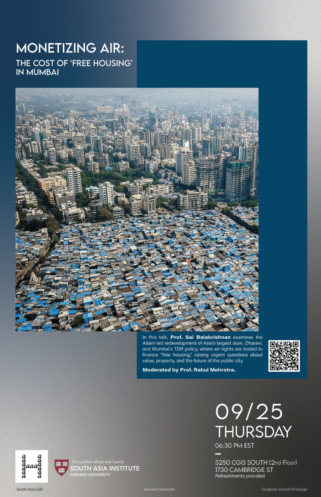 In 2023, one of India’s most powerful conglomerates, the Adani Group, secured the contract to redevelop Dharavi, popularly referred to as ‘Asia’s largest slum.’ The most coveted asset in the Dharavi redevelopment is air: the state is offering air-rights as incentives for rehabilitating ‘slum dwellers.’ This talk reveals the costs and contradictions of Mumbai’s ‘free housing’ policy, and the planning processes through which public resources (like air) are privatized in vertical cities.