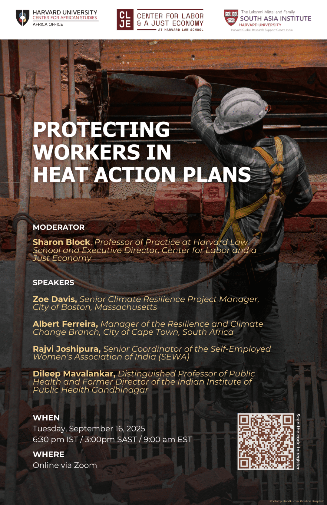 Join us for a webinar on “Protecting Workers in Heat Action Plans,” organized jointly by the Mittal Institute, Center for Labor and a Just Economy at Harvard Law School, and Africa Office of the Harvard University Center for African Studies. Across the globe, extreme temperatures and severe heatwaves are already impacting the health and safety of workers. States and cities from India to South Africa to the United States are developing Heat Action Plans to help their communities prepare for the worst impacts, including outdoor and indoor workers alike. This webinar will explore how Ahmedabad, Boston, and Cape Town have developed and implemented Heat Action Plans, and why engaging with workers and their representatives is central to their success.