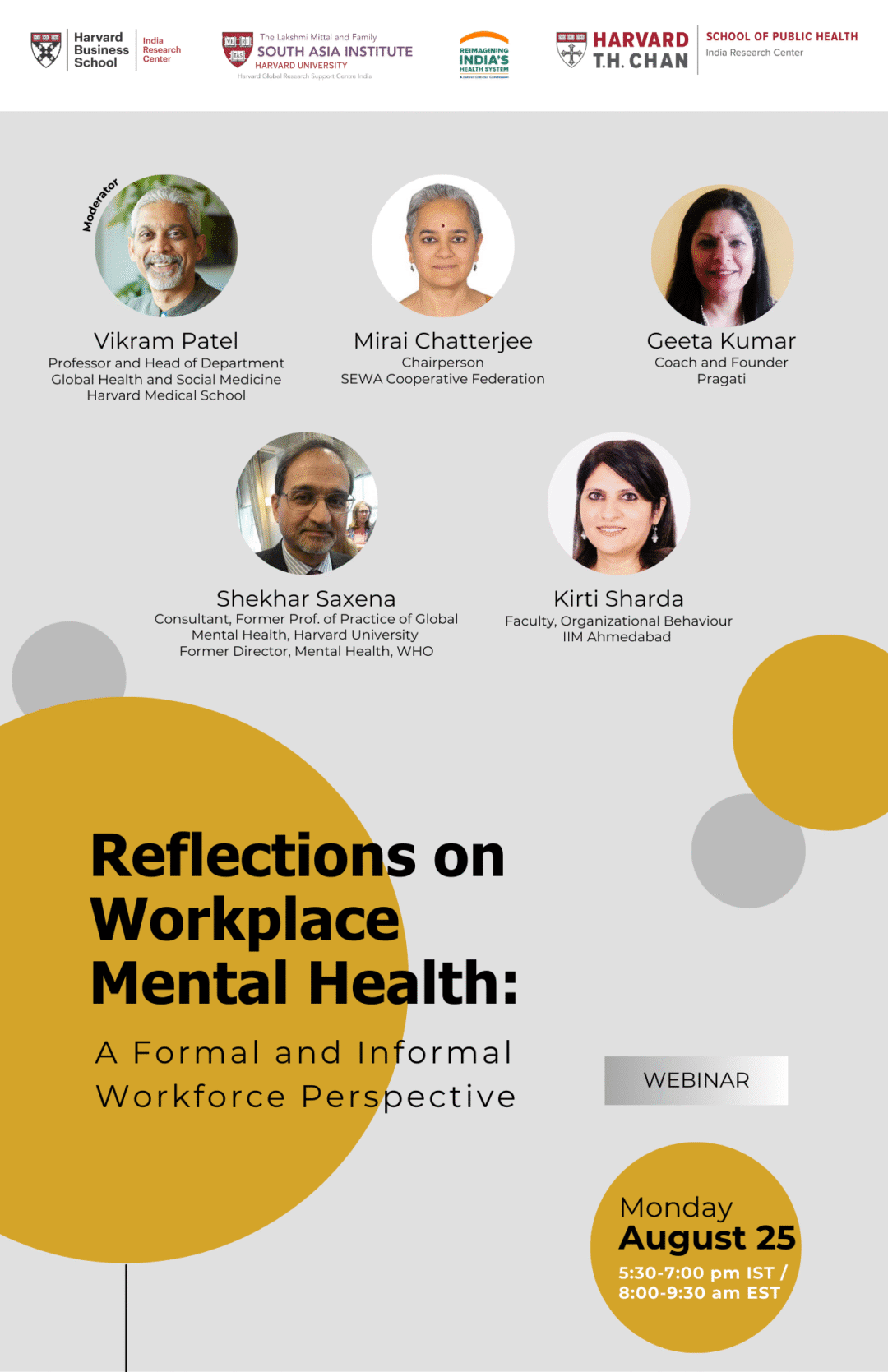 Join us for a webinar on “Reflections on Workplace Mental Health: A Formal and Informal Workforce Perspective,” organised jointly by the Mittal Institute, Harvard Business School–India Research Centre, Harvard T.H. Chan School of Public Health–India Research Centre, and Lancet Citizens’ Commission on Reimagining India’s Health System.