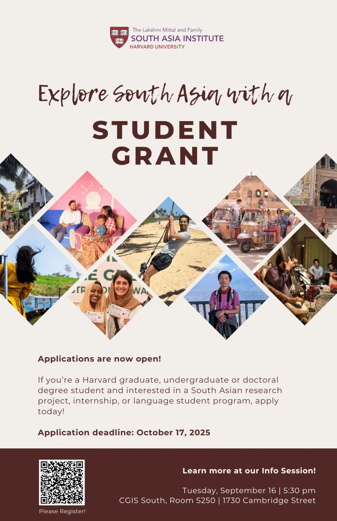 Applications for the Mittal Institute winter grants are now open! If you’re a current undergraduate, graduate, or doctoral student at Harvard interested in a South Asian research project, internship, or language study program, apply by October 17, 2025.