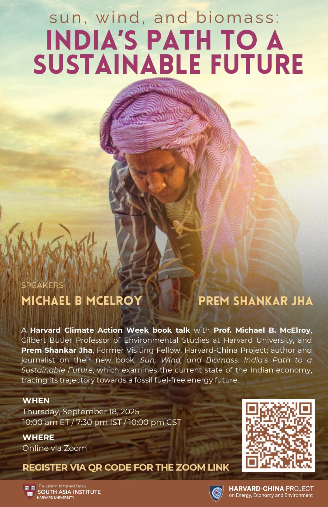 Join Prof. Michael B. McElroy and journalist Prem Shankar Jha as they discuss their new book, Sun, Wind, and Biomass: India’s Path to a Sustainable Future. The book examines the current state of the Indian economy, tracing its trajectory towards a fossil fuel-free energy future. It posits that harnessing sun, wind, and biomass can provide a sustainable economic alternative to polluting energy sources such as domestic coal and expensive oil and gas imports. Such a transition is projected to provide substantial benefits not only for the national economy but also for public health, the latter occasioned by the anticipated improvements in air quality resulting from the projected change in the energy system. Contrary to the concerns about the negative implications for economic development, the authors suggest that the transition to a carbon-free future offers a range of beneficial opportunities, especially for the youth in impoverished rural environments. Thus, they situate India’s transition away from fossil fuels within the context of planet Earth’s history, underscoring the abruptness of humanity’s encounter with the reality of a potentially devastating and relatively immediate change in global climate.