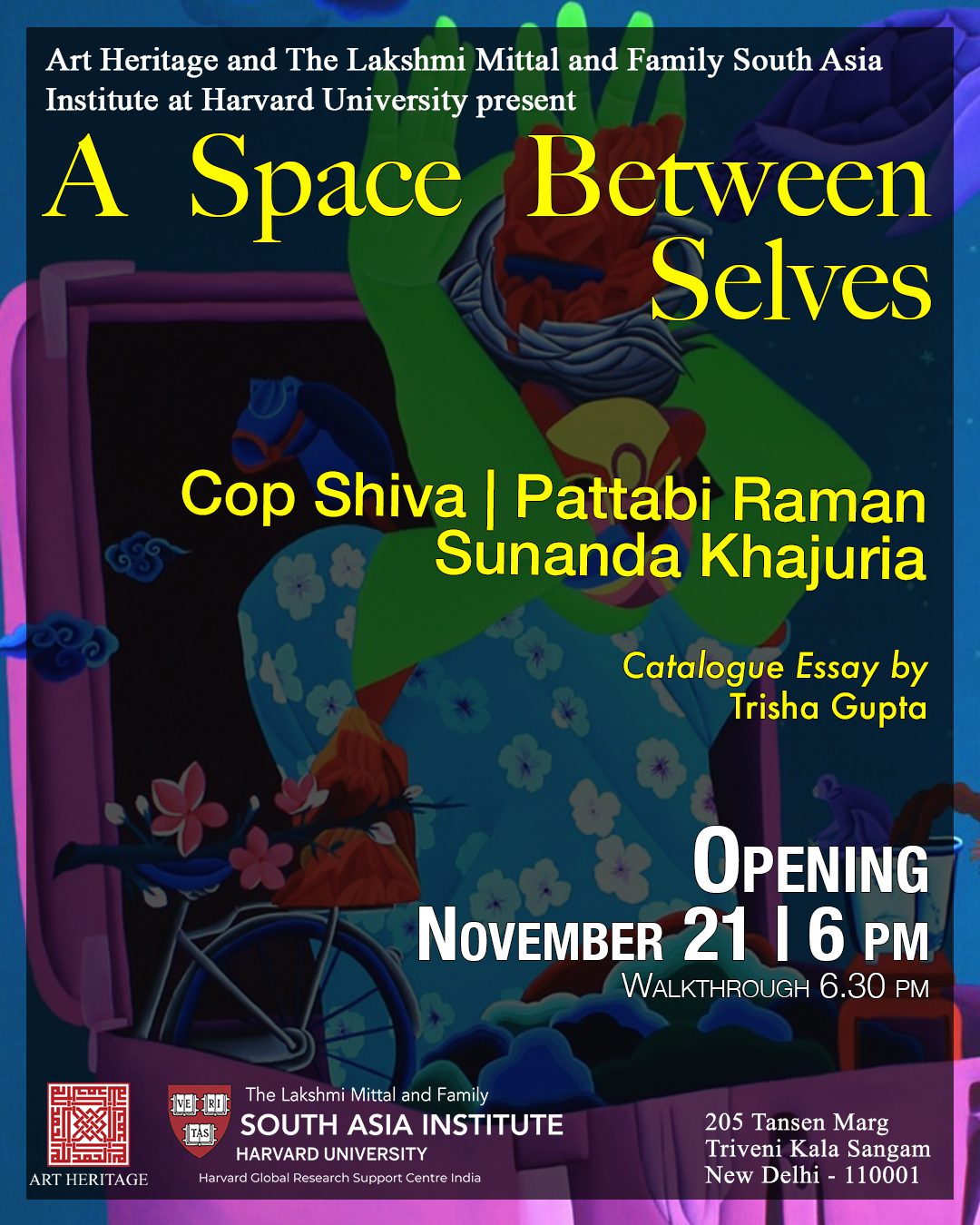 Art Heritage and The Lakshmi Mittal and Family South Asia Institute at Harvard University present “A Space Between Selves,” an exhibition of artworks by Mittal Institute’s three former Visiting Artist Fellows—Cop Shiva, Pattabi Raman, and Sunanda Khajuria—whose practices reflect a deep engagement with identity, transformation, and cultural hybridity.
