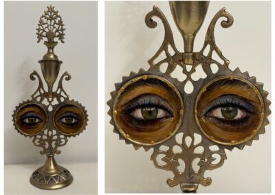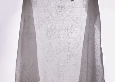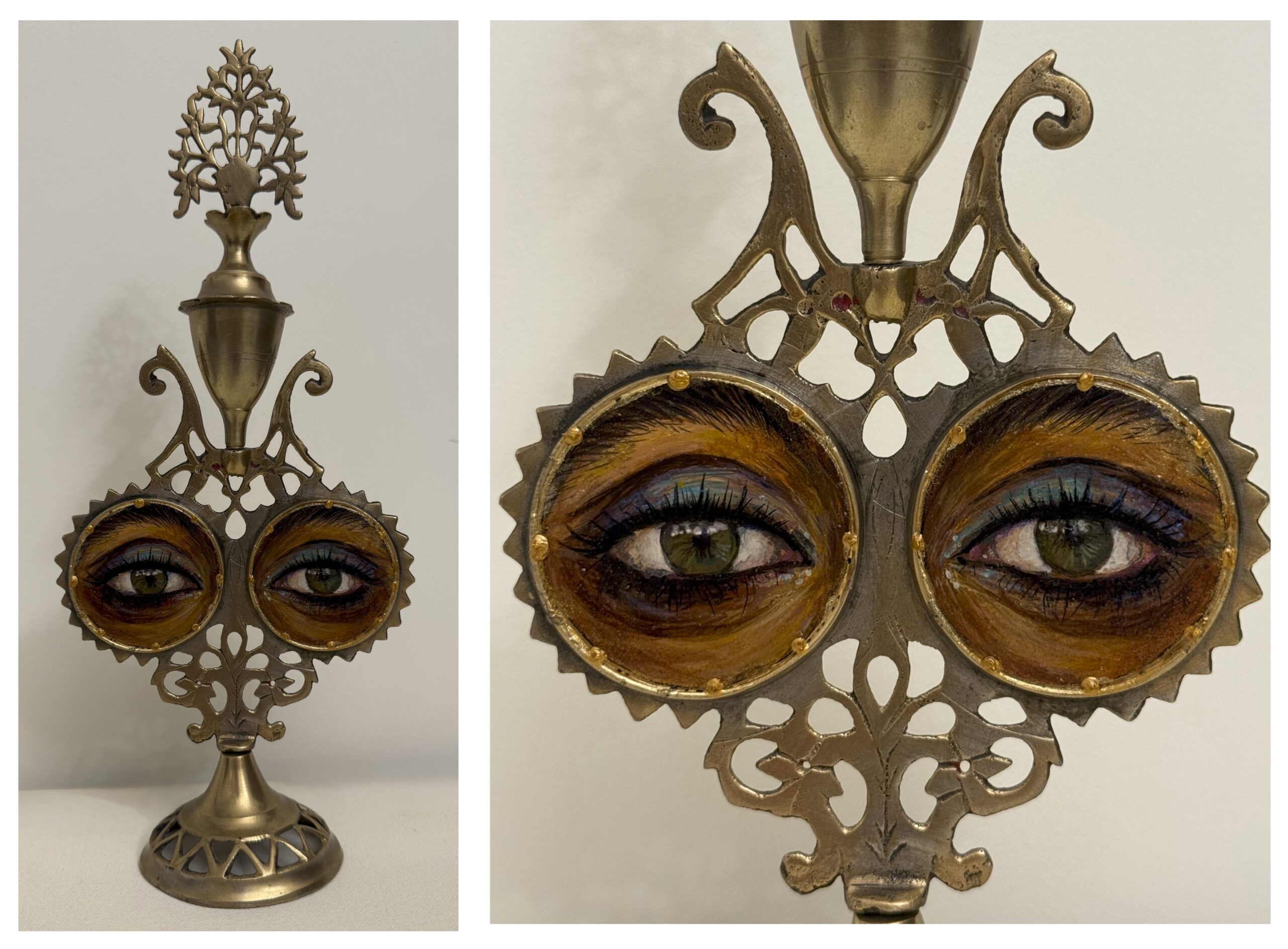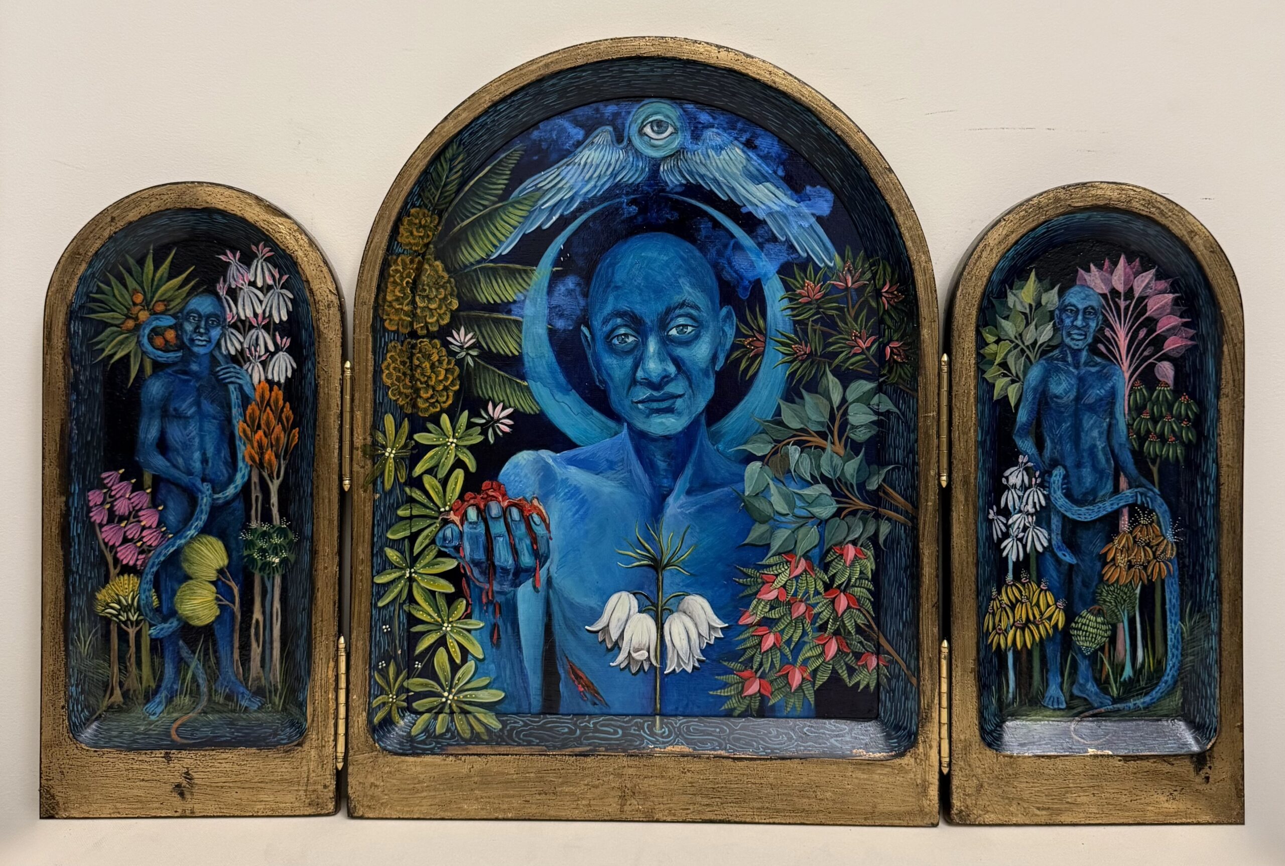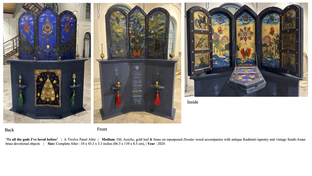 This sacred altarpiece confronts violence, the demolition of heritage, and the abandonment of cherished objects imbued in familial memory. Its visual language draws from Abrahamic religions, the cosmos, the spirit world, flora, fauna, and pain. Constructed from wood salvaged from a demolished home in Lahore, the twelve-panel freestanding piece invites viewers to walk around and engage. Front panels depict families amid loss and devastation; back panels reveal gods, monstrous forces, and humanity’s wrath. Inner panels whisper hidden paradises and celestial beings. Vintage South Asian ritual objects, rosaries, incense burners, amulets, express what cannot be spoken, bridging history, faith, and intimate human experience.