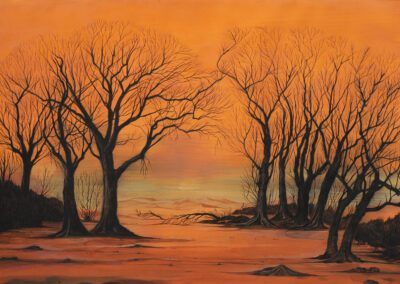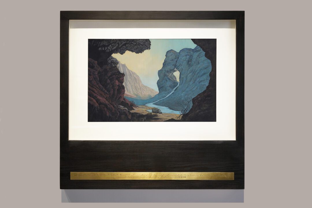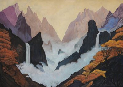 “Enchanted Land” consists of landscapes that don’t exist yet feel familiar: serene mountains, cascading waterfalls, visions and land promised by politics and faith alike. The idea of a perfect homeland, a paradise, is often a fantasy forged in the crucible of violence. I feed this fantasy to the machine, asking artificial intelligence to generate visions of heaven: idyllic, lush, and uninhabited. Later, by repainting them with gouache,