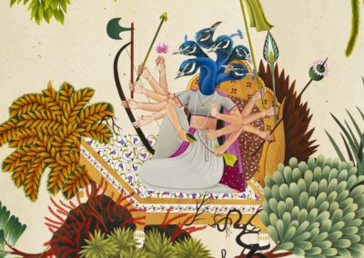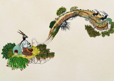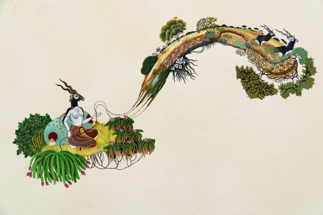 In this painting, a Chthonic Being emerges through the hybrid form of a Yogini embodying the spirit of the endangered blackbuck – a graceful and endangered antelope, embodying both vulnerability and strength.