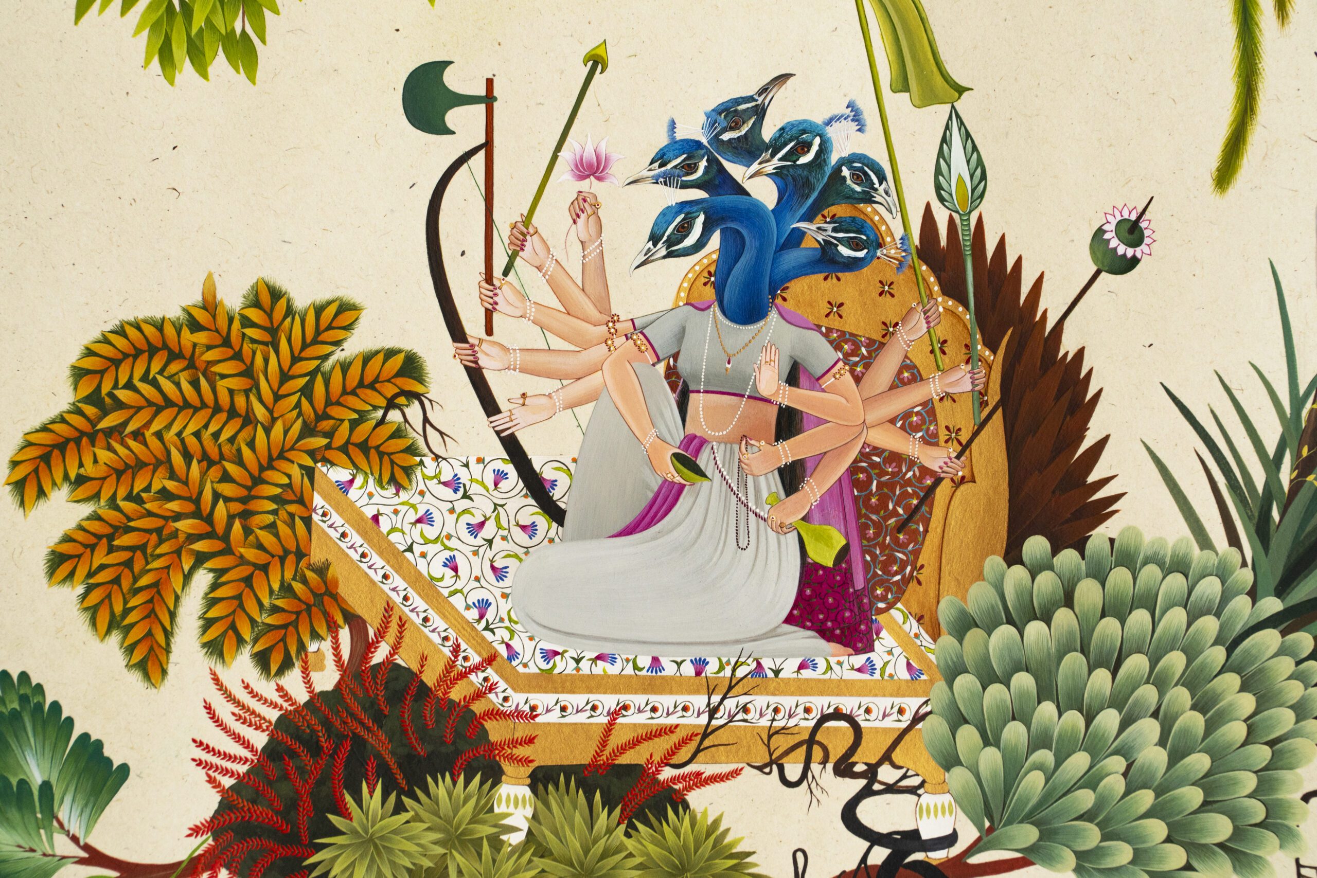 She rides a chariot not made of metal or stone, but of living plants, which takes reference from calotropis gigantea, acacia, and wild grasses. These are plants rooted in resilience, survival, and connection to arid landscapes.